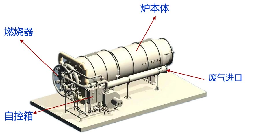 采用辅助加热器(天然气/燃料油/电)提供辅助热源,将废气温度加热至污染物自燃温度以上,将污染物热氧化为CO2、H2O、N2等非污染成分