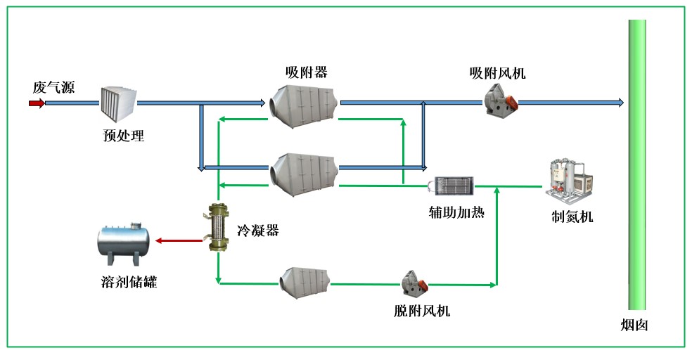 采用活性炭(树脂)将污染物吸附,吸附饱和后通过氮气循环升温脱附,然后冷凝回收有机物。