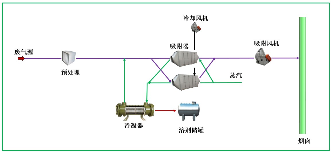 采用活性炭(树脂)将污染物吸附,吸附饱和后通过蒸汽脱附,然后冷凝回收有机物。